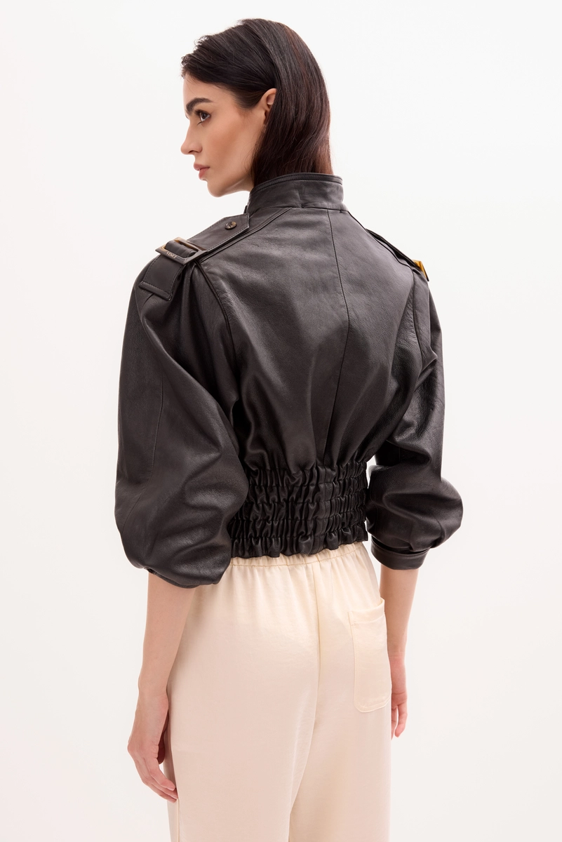CZARNA KURTKA SKÓRZANA Z RZĘDAMI GUM W TALII I PAGONAMI NA RĘKAWACH