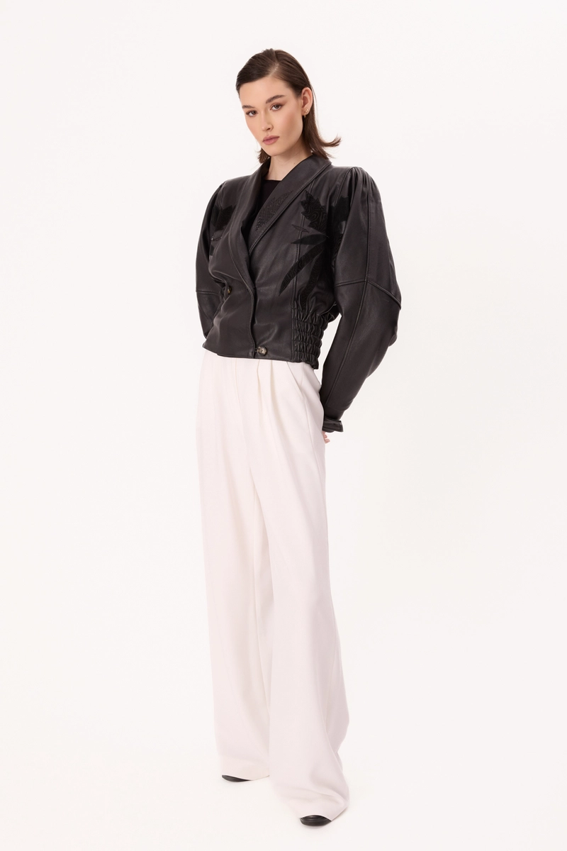 Czarna, krótka ramoneska VINNCI z ozdobnymi welurowymi tłoczeniami to prawdziwa perełka z drugiego obiegu – odnowiona i przerobiona z dbałością o każdy detal, by mogła służyć przez kolejne sezony. Unikatowa i stylowa, łączy klasyczną formę z nowoczesnym charakterem. Krótki fason z pięcioma rzędami regulowanych gum w talii podkreśla sylwetkę i dodaje jej wyrazistości, a klamry w rękawach i precyzyjne wykończenia dopełniają całość, tworząc ponadczasowy element garderoby.