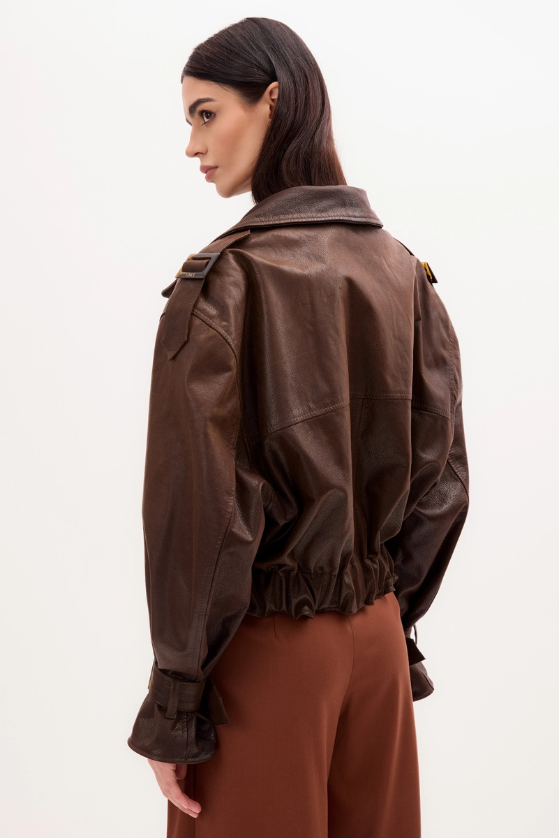 CZEKOLADOWA KURTKA SKÓRZANA Z KLAMRAMI I PAGONAMI