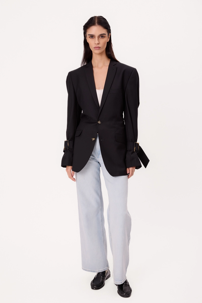 DŁUGA CZARNA MARYNARKA PETITE Z REGULACJĄ W TALII I KLAMRAMI MODEL No6