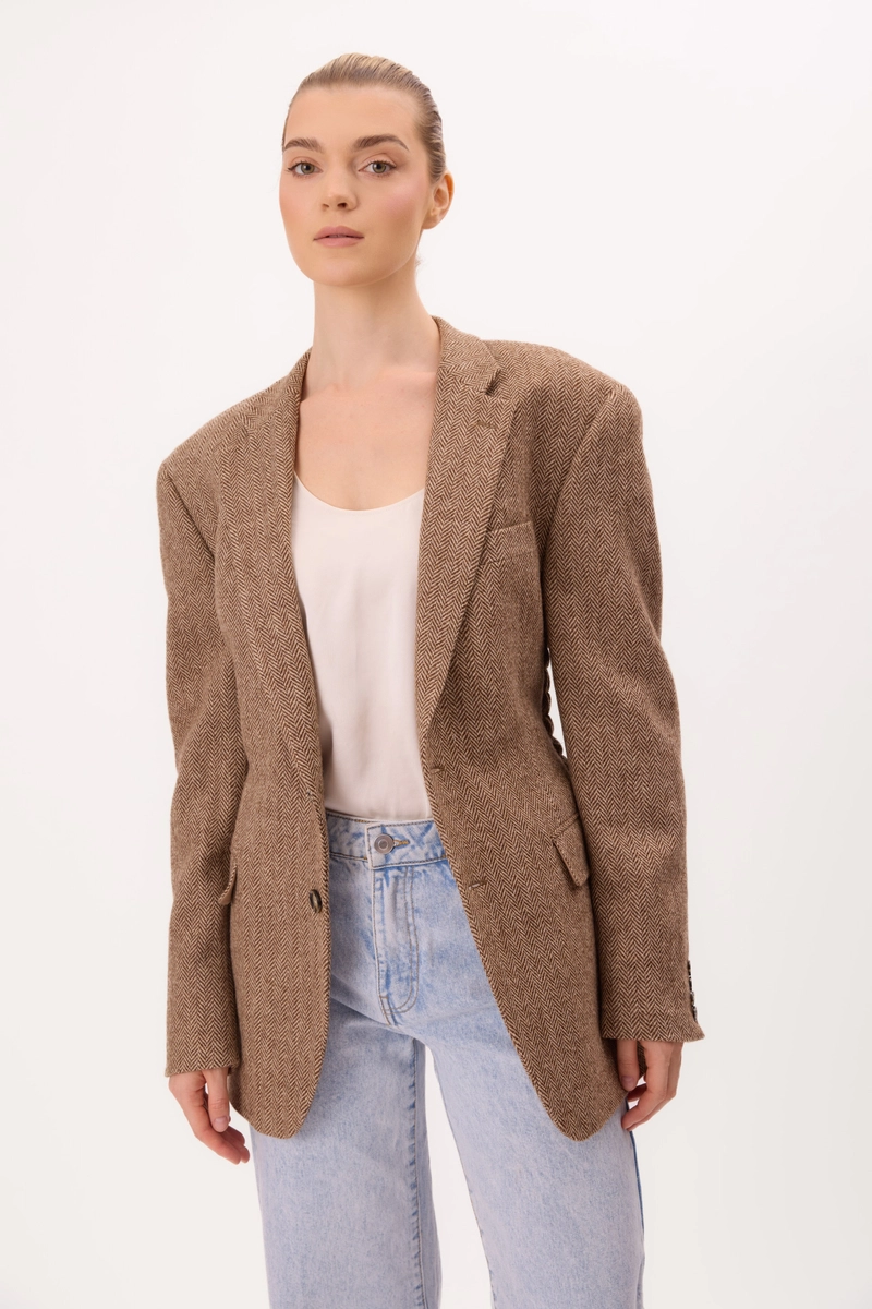 DŁUGA JASNOBRĄZOWA TALIOWANA MARYNARKA W JODEŁKĘ MODEL No4