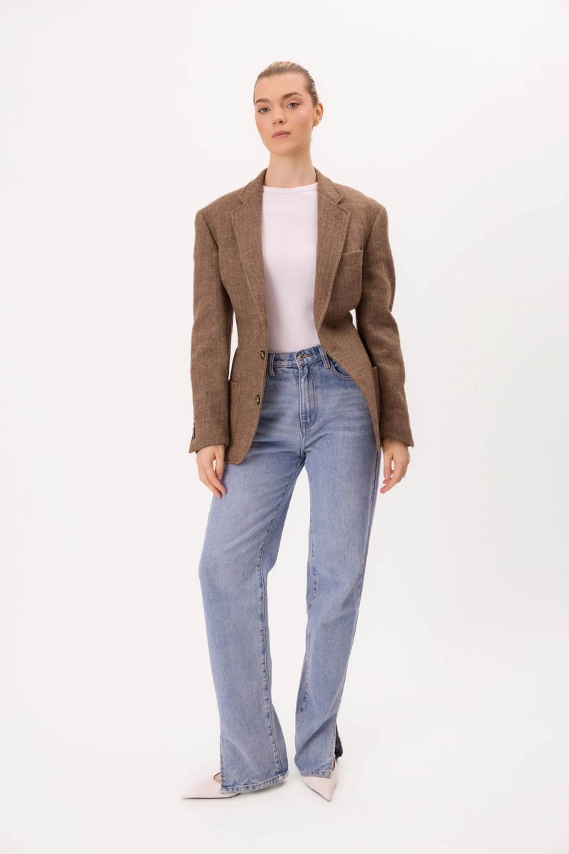 DŁUGA JASNOBRĄZOWA TALIOWANA MARYNARKA W JODEŁKĘ MODEL No4