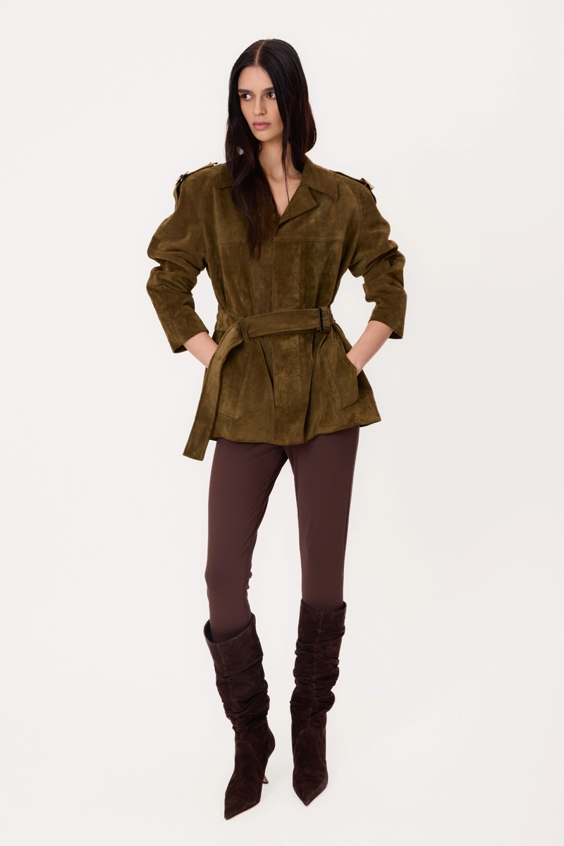 DŁUGA ZAMSZOWA ZIELONA REGULOWANA W TALII KURTKA SKÓRZANA Z PASKIEM