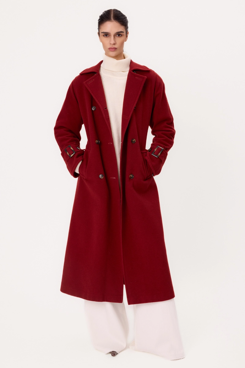 DŁUGI BORDOWY REGULOWANY W TALII WEŁNIANY PŁASZCZ Z KLAMRAMI