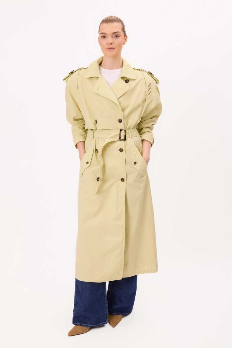DŁUGI JASNOZIELONY MAXI TRENCH COAT REGULOWANY W TALII PŁASZCZ Z PASKIEM
