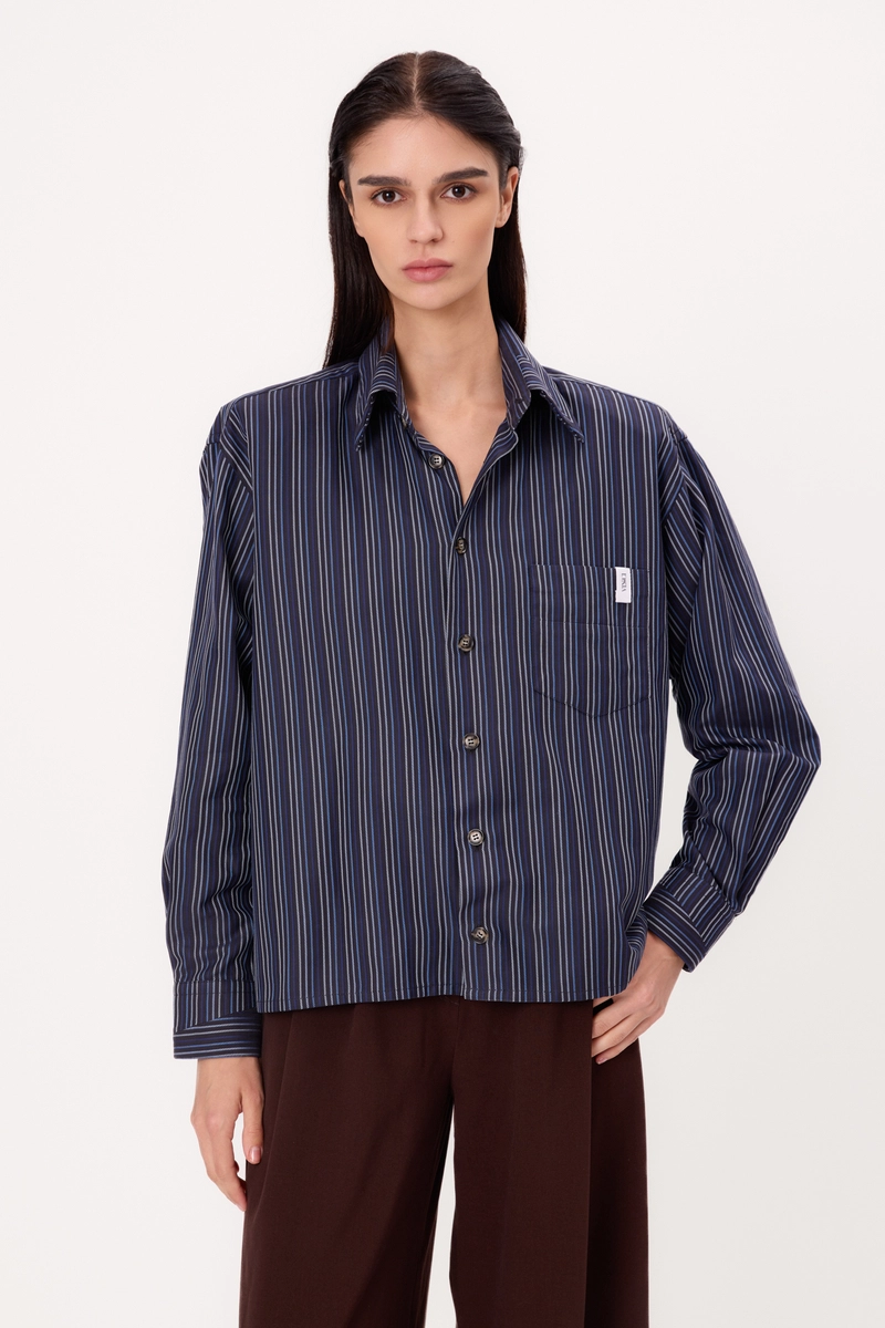 GRANATOWA KOSZULA REGULAR OVERSIZE W NIEBIESKIE PASKI Z ODPINANYMI PODUCHAMI