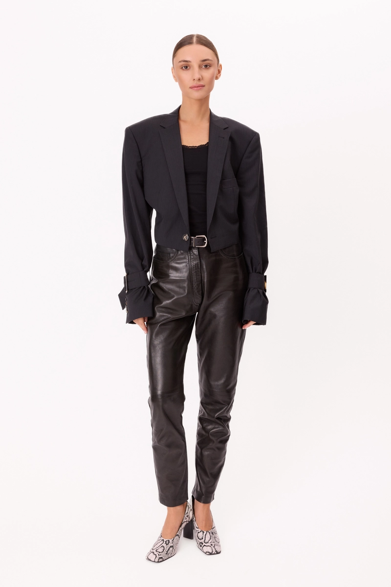 Granatowa marynarka VINNCI w delikatny prążek to upcyclingowy projekt stworzony z męskiej marynarki. Przekształcona w krótszy fason, łączy klasyczną formę z nowoczesnym krojem. Zwężana w talii, z szerokimi ramionami, pięcioma rzędami regulowanych gum, satynowymi klapami, logowanymi guzikami i klamrami w rękawach – ponadczasowa i unikatowa, stworzona z myślą o stylu i świadomej modzie.