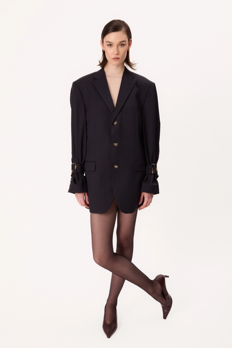 Granatowa marynarka VINNCI w delikatne paski to upcyclingowy projekt stworzony z męskiej, oversize’owej marynarki. Długi fason z pięcioma rzędami regulowanych gum w talii pozwala dopasować model do sylwetki, podkreślając jej proporcje. Klamry w rękawach i logowane guziki nadają całości nowoczesny charakter, zachowując przy tym klasyczną elegancję. Starannie odnowiona i przerobiona, łączy ponadczasowy styl z ideą świadomej mody.