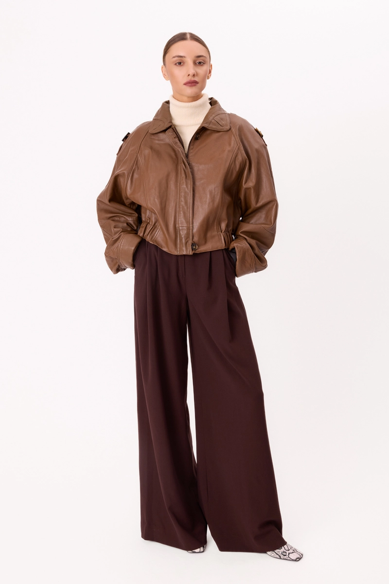 Brązowa kurtka skórzana VINNCI to prawdziwa perełka z drugiego obiegu – odnowiona i przerobiona z dbałością o każdy detal, by mogła służyć przez kolejne sezony. Unikatowa i stylowa, łączy klasyczną formę z nowoczesnym charakterem. Krótki fason z szeroką gumą w talii i pagonami, podkreśla sylwetkę i dodaje wyrazistości. Zapięcie na zamek i precyzyjne wykończenia tworzą ponadczasowy, wyjątkowy element garderoby.