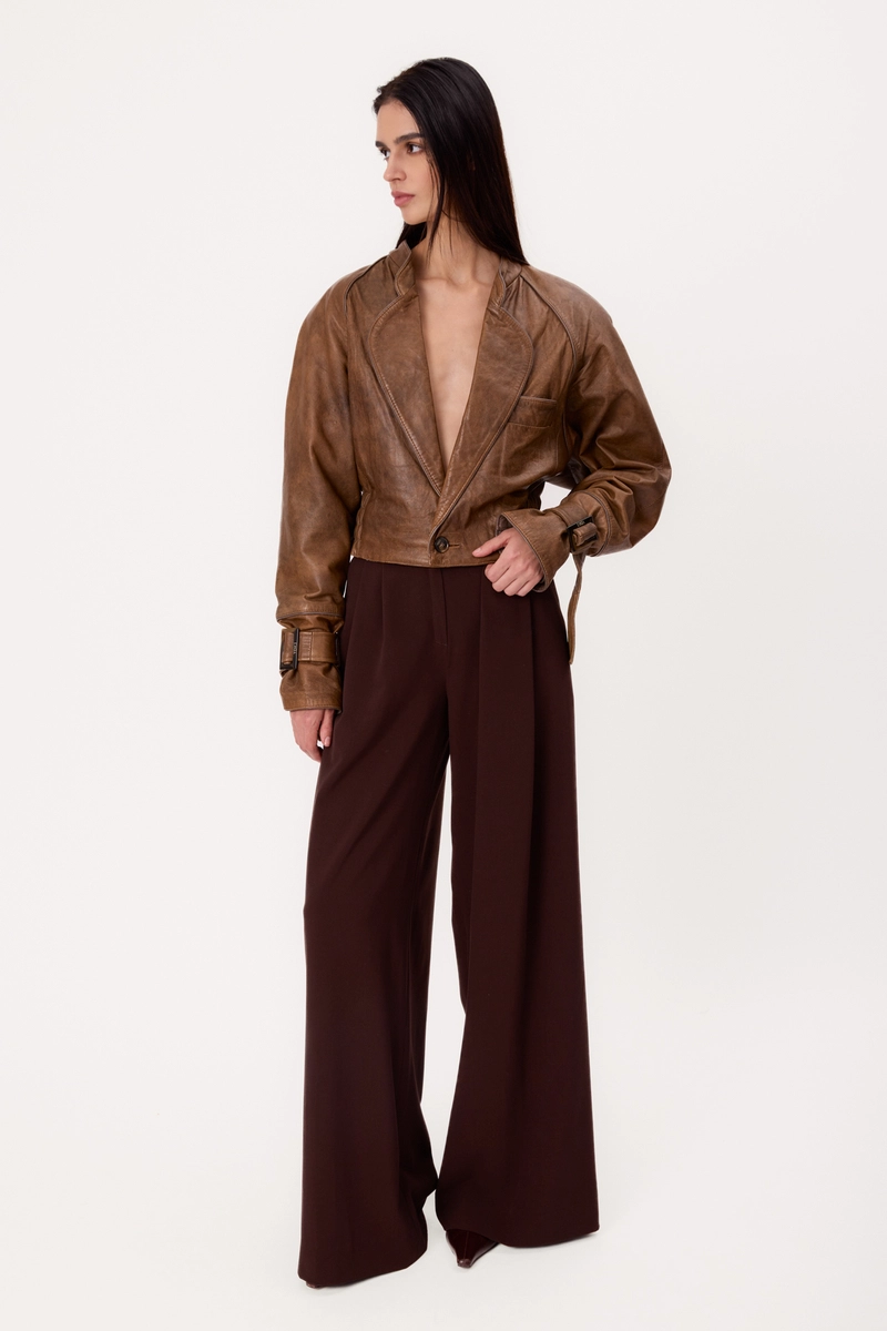 KRÓTKA BRĄZOWA REGULAR REGULOWANA W TALII PRZECIERANA KURTKA SKÓRZANA