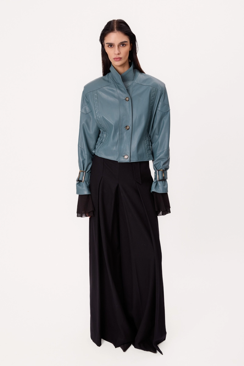NIEBIESKA REGULOWANA W TALII KURTKA SKÓRZANA TALL Z KLAMRAMI