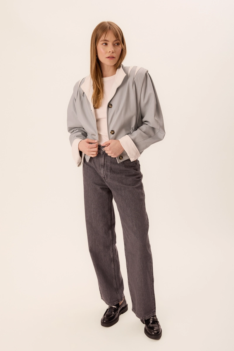 POPIELATA TALIOWANA KURTKA SKÓRZANA Z BIAŁYMI ELEMENTAMI